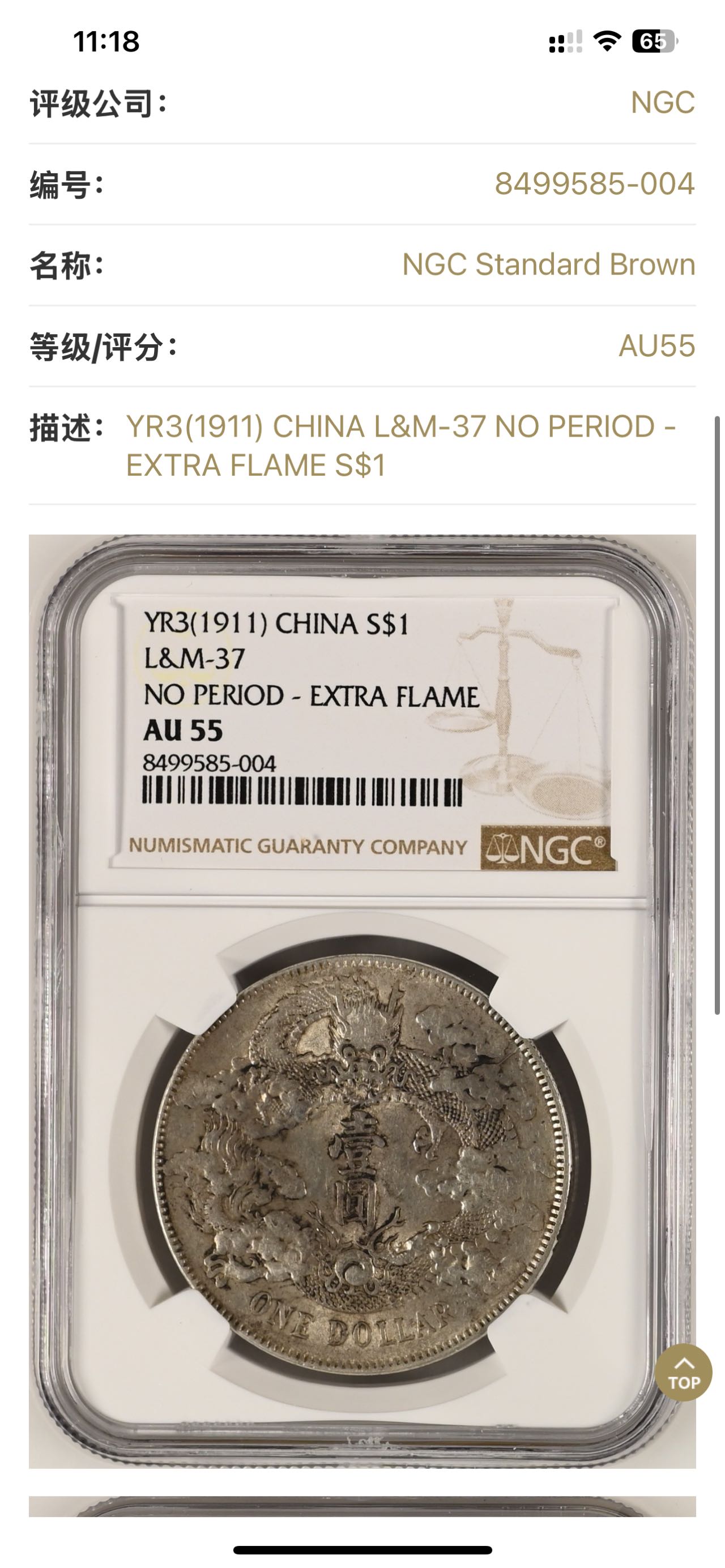 美国NGC评级AU55分 原生态 带黑色老墨迹