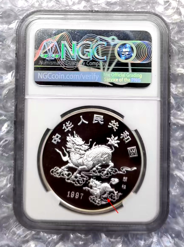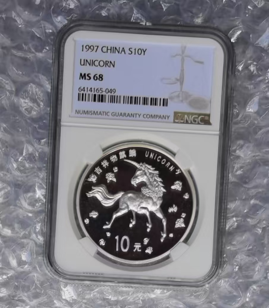 1997麒麟银币,少见的空云版,早期严评NGC68,卖580元