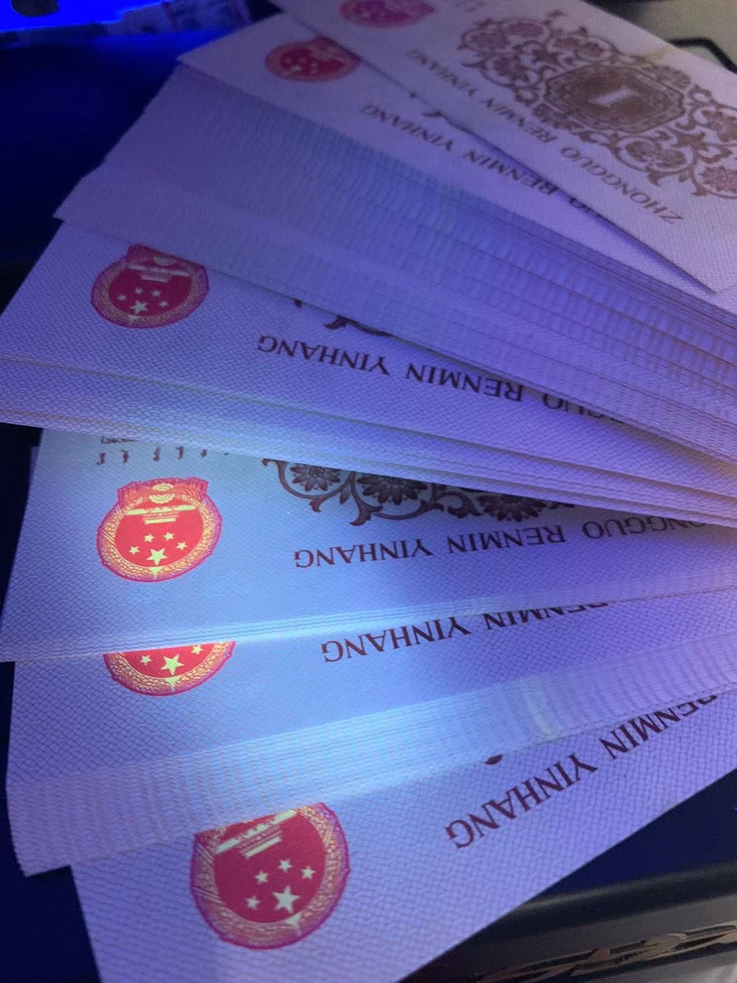 金光冰玉598冠倒置号0169组合:1刀,全新原票百连。荧光冰玉+国徽金光荧光,中间轻微捆印。