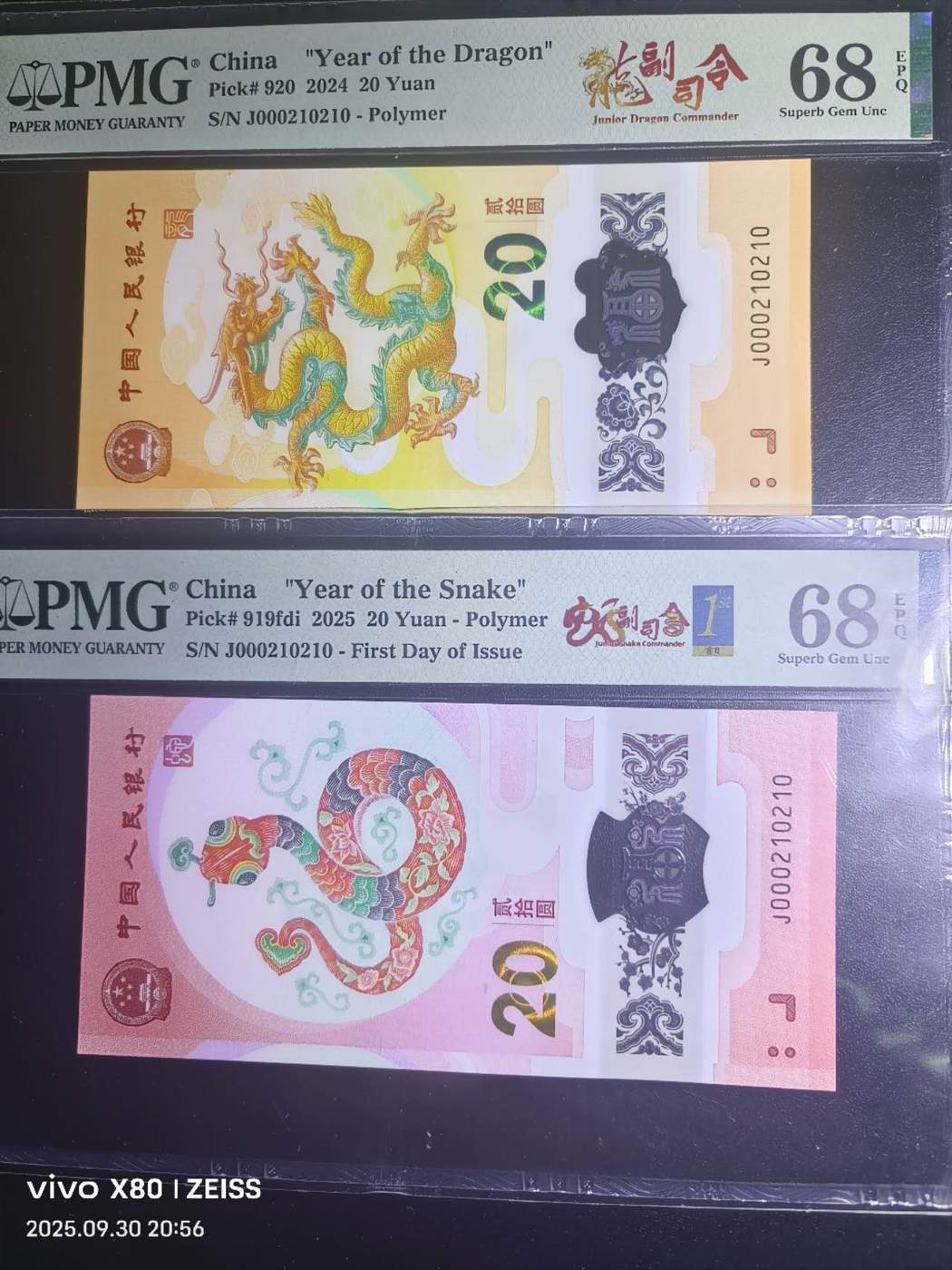 上涨品种,小司令龙三012尾循环号龙钞蛇钞全同号,分数也一样都是PMG68分,11500款到包顺丰