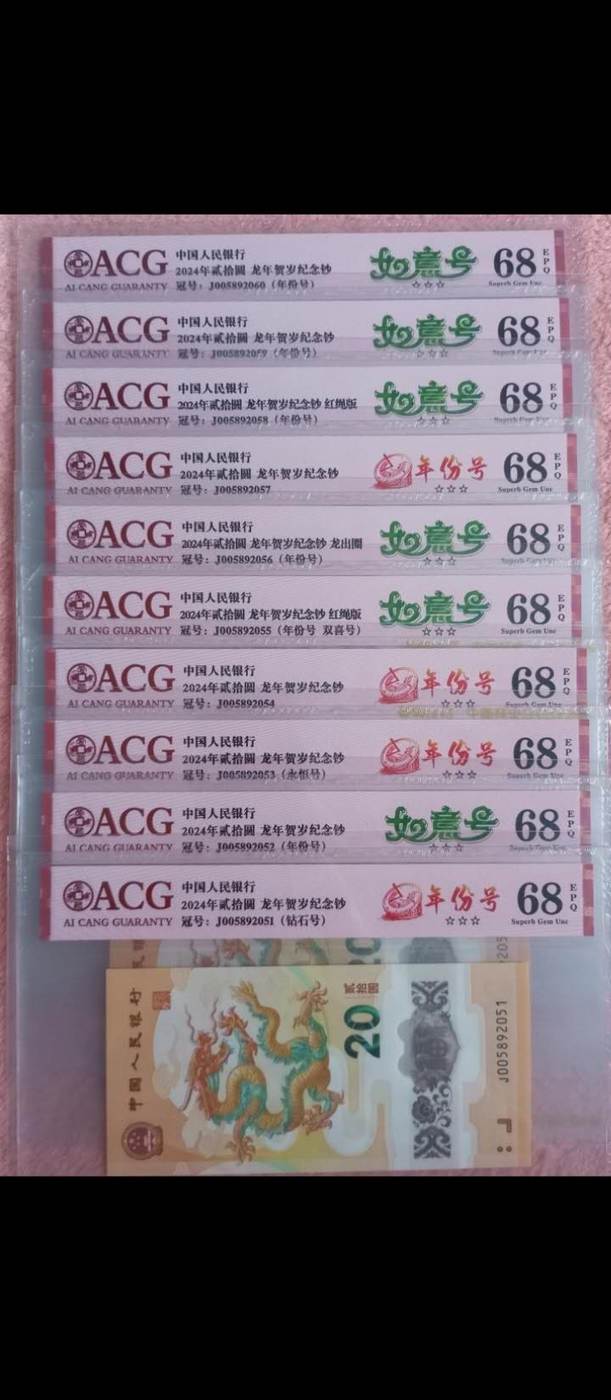 原票未修全部爱藏68分无347钻石号如意号年份号新标十:J005892051组售12888元,号码及评分具体图片为准。