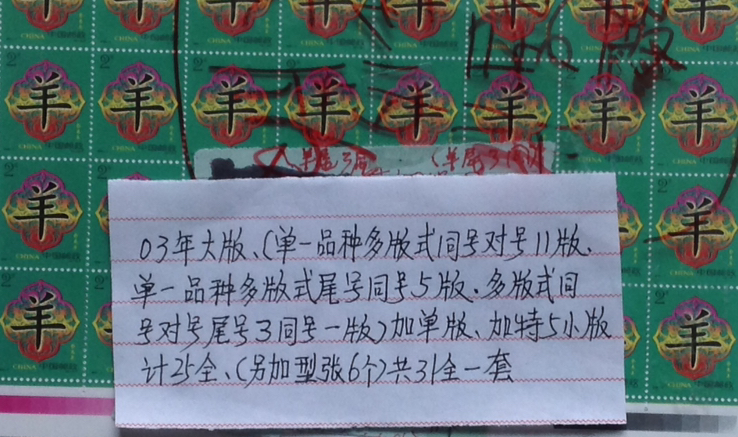 03年大版,(多版式同号对号11版,内含一版有豹子号0111...,)多版式同号对号尾号三同号一版,尾二同号一版。含非典,加特5小版加单版, 计26全(另加型张6个)共32全一套。