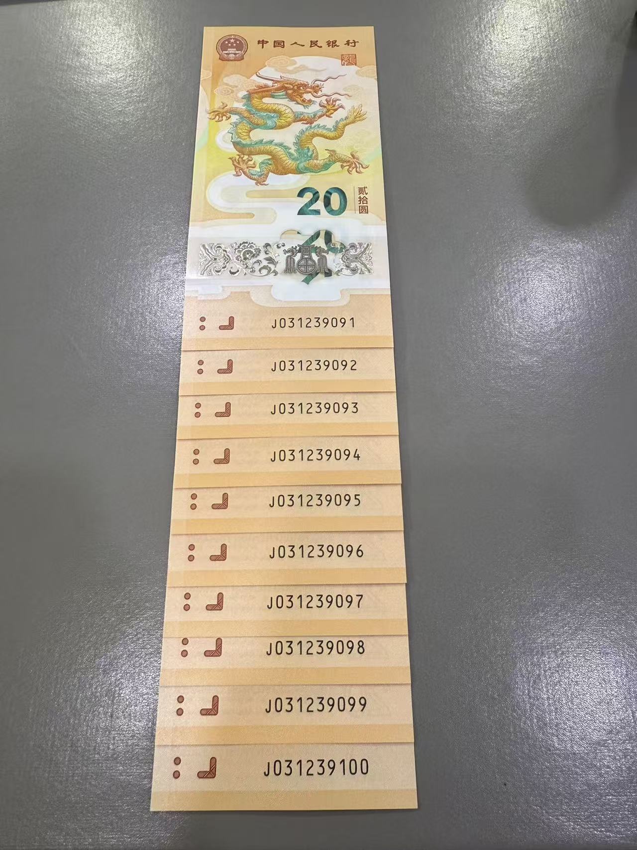 出售一组小龙钞无47尾91标十,灯下无斑,无折无指甲印,未修复未评级,号码如图,2300包快。