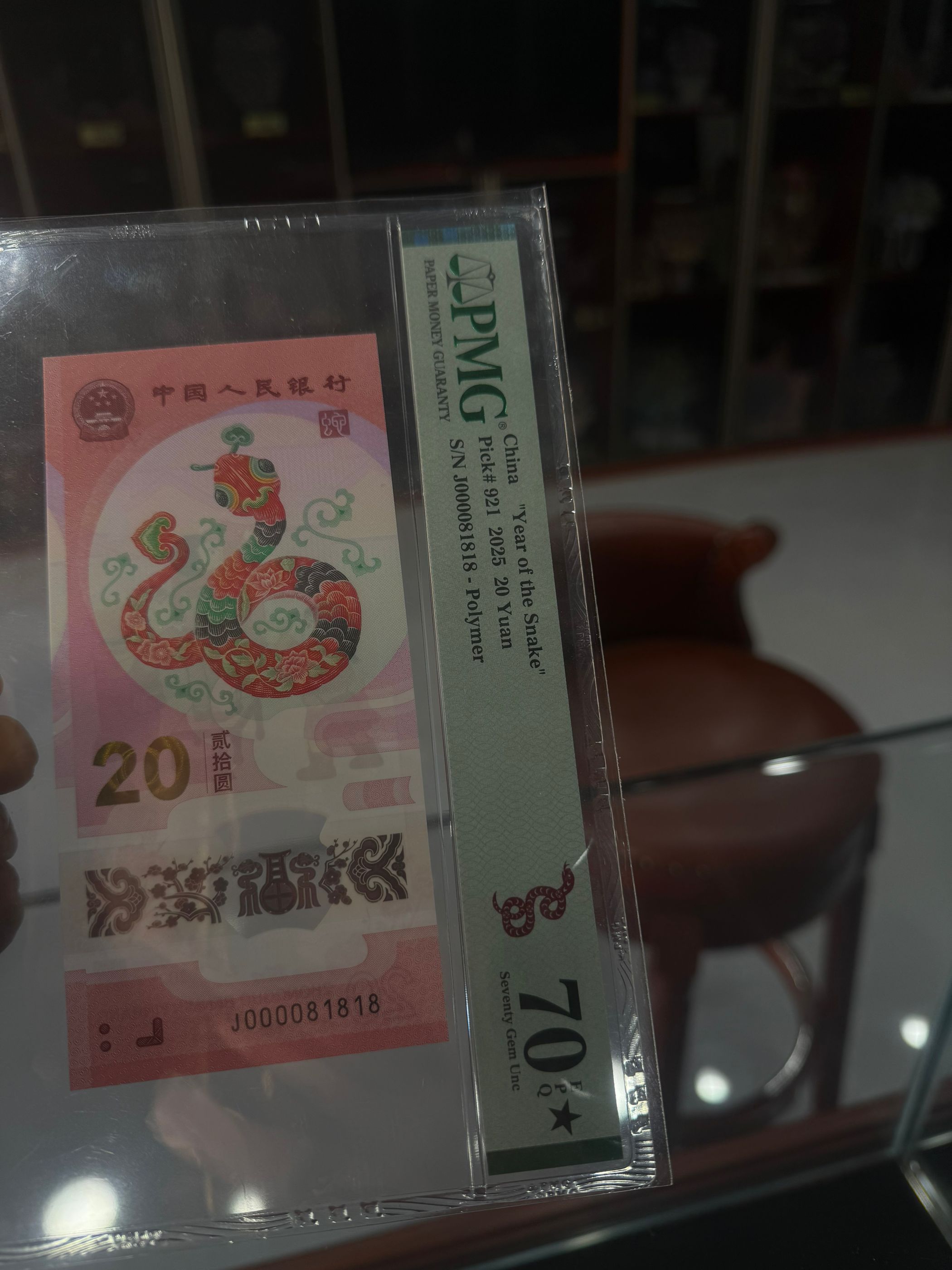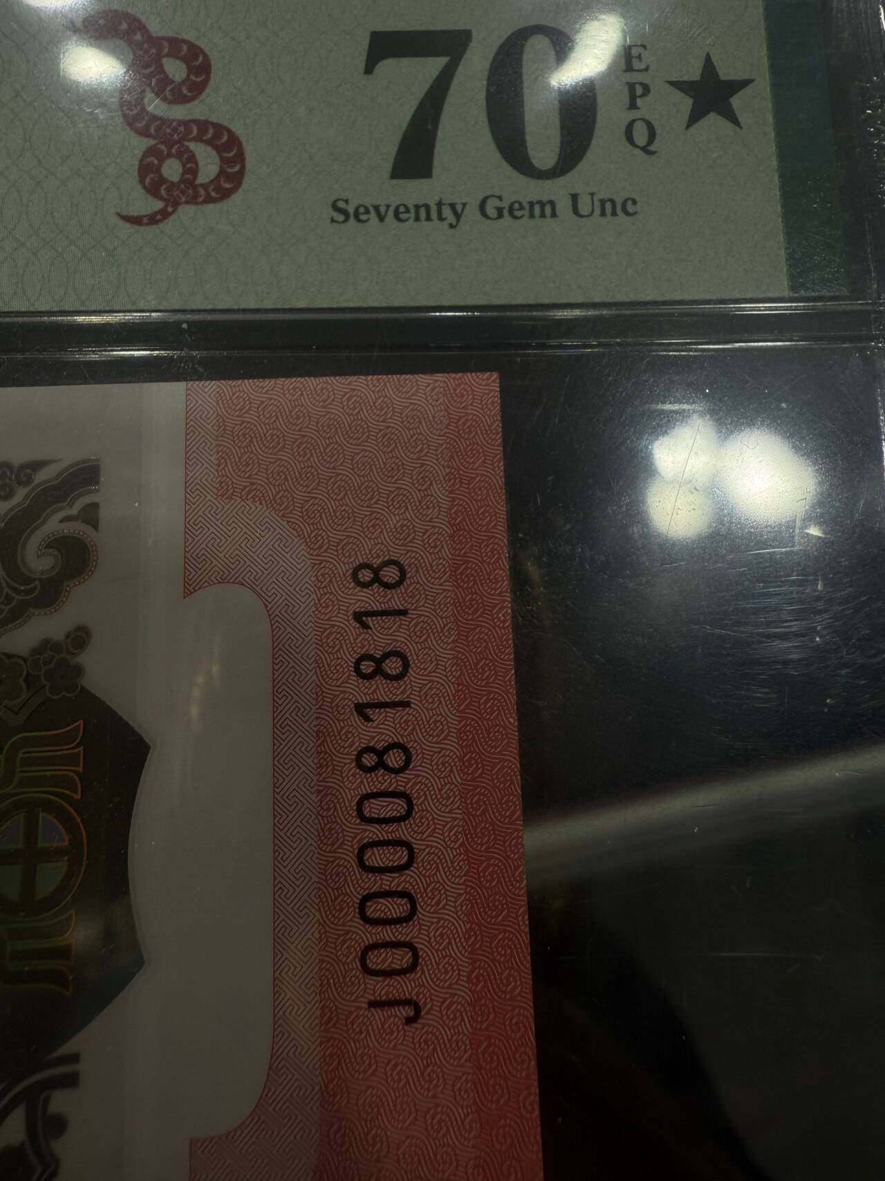 生肖蛇钞;司令000081818属于第二组生肖钞,次枚钞号码题材很多,大司令,倒制018组合在整组生肖钞数量占比很小,018AB号更是难得,及其难得是PMG给了70分大黑星更是锦上添花。