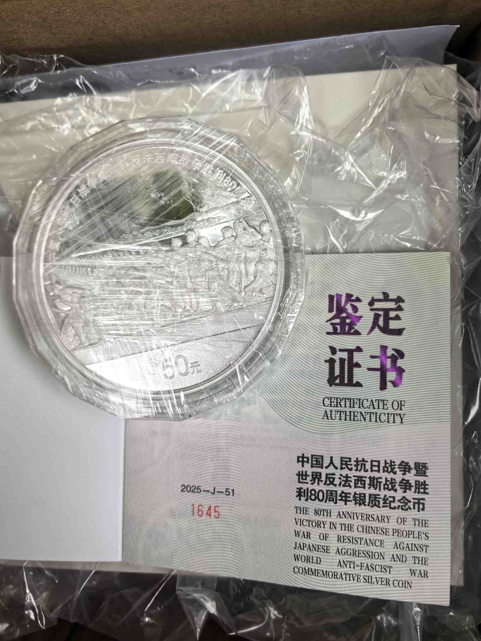 → 售一套抗战80周年150克银币。证书号1645