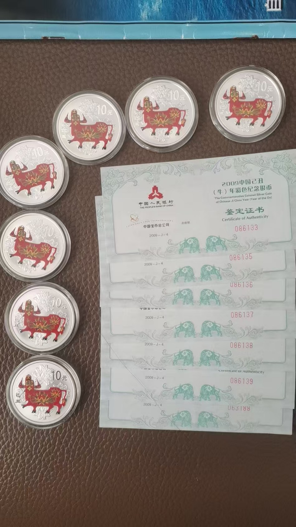 2009年一盎司彩银牛币,带中国人民银行的鉴定证书,配有原始透明塑料圆盒,面值10元。
