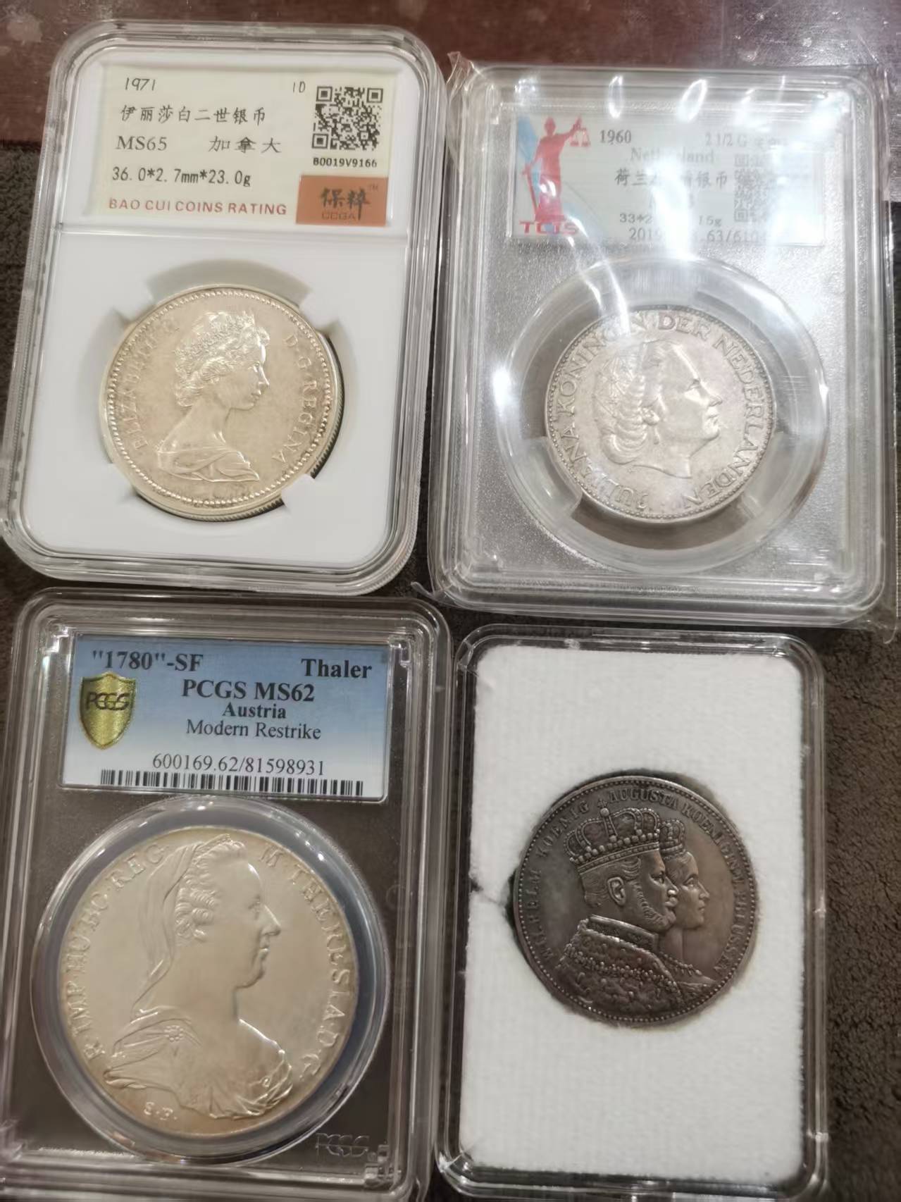如图(1):左上角加拿大银币23克,右上角荷兰银币15克,左下角奥地利泰勒银币28克,右下角双人头像银币18.6克,