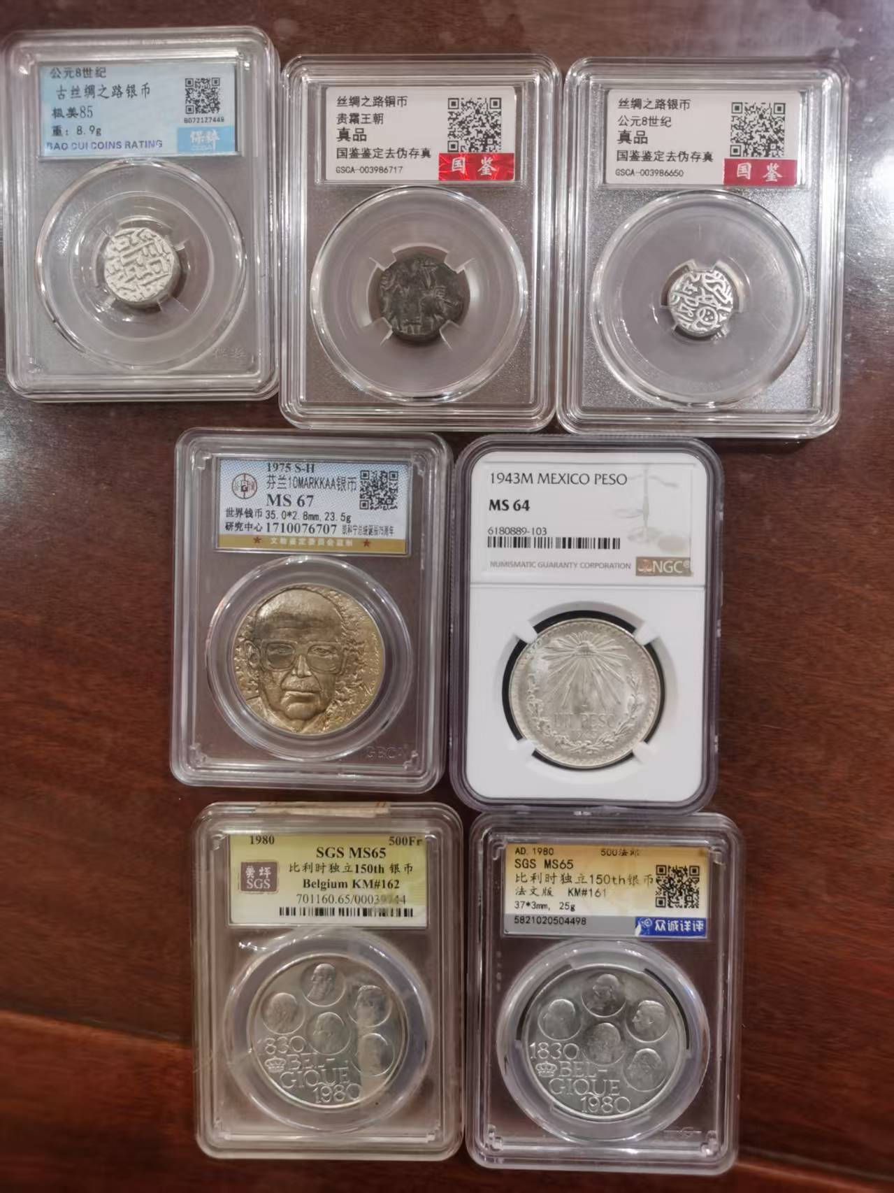 如图(2)丝绸之类银币2枚(中间一枚除外)17克,芬兰银币23.5克,墨西哥银币27克,比利时银币2枚50克,合计202克*10元=2020元,款到发货