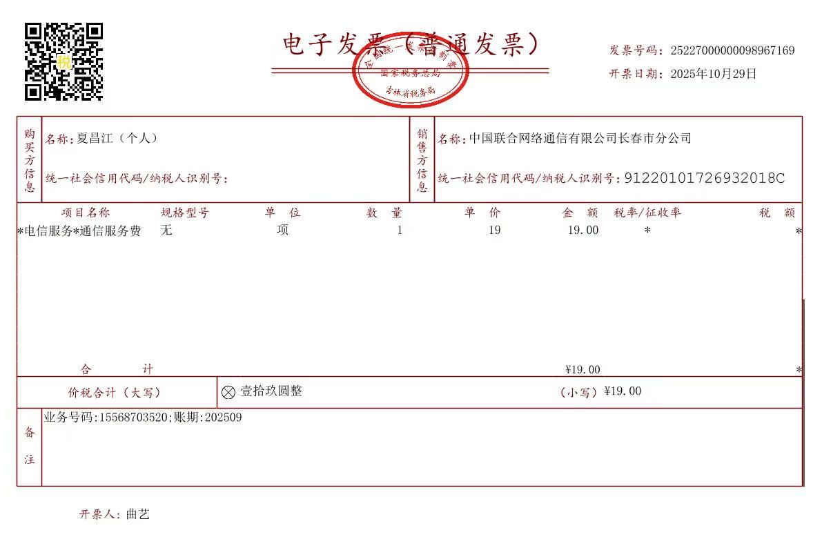 由于联通APP不能通过账单形式显示完整姓名和手机号,特开具发*票形式用于验证,发*票中完整显示了姓名和手机号