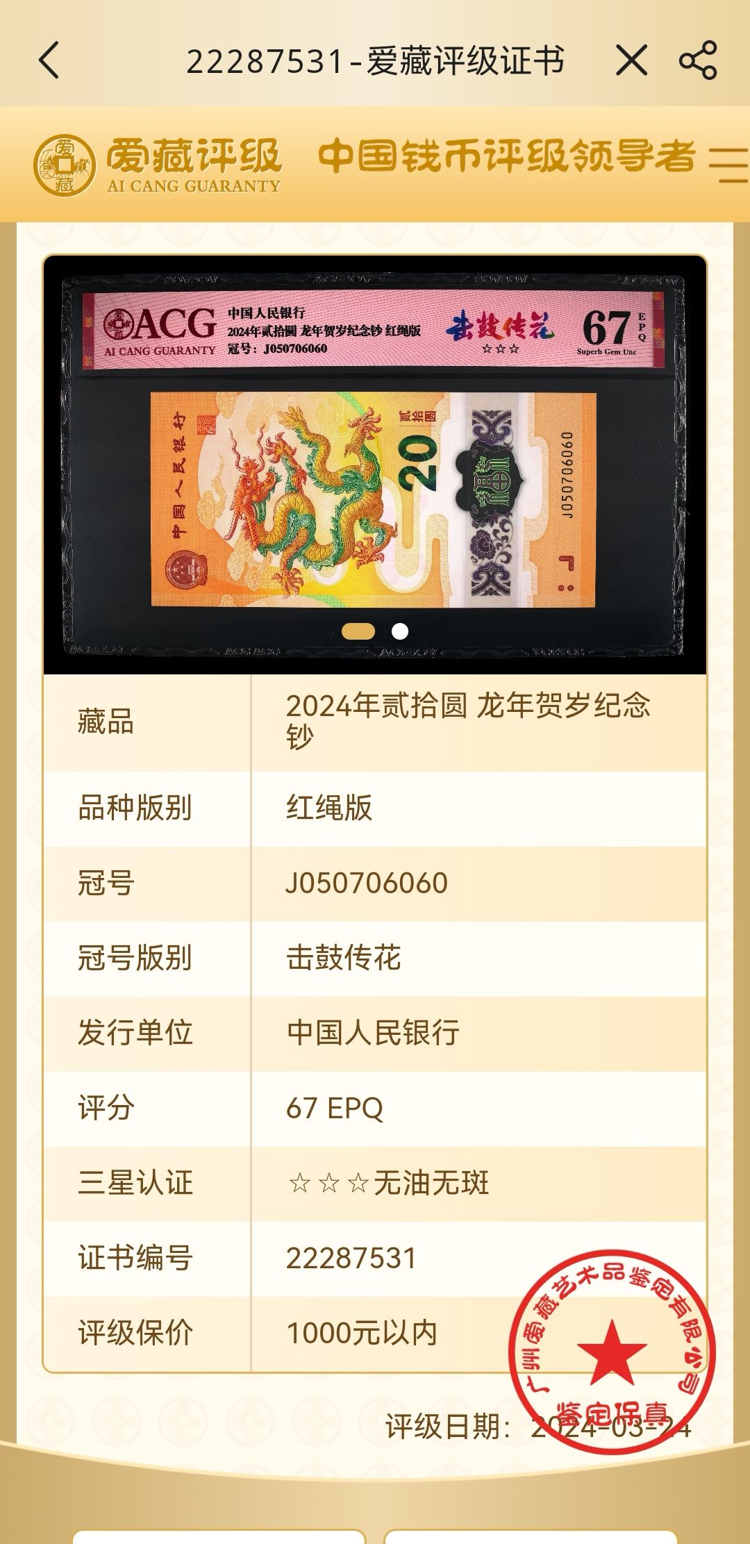 070506060,爱藏67,1580包顺丰,2024年3月评级的。具体如图