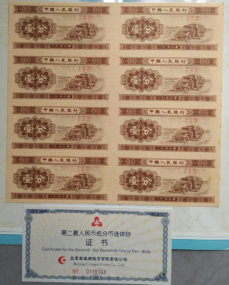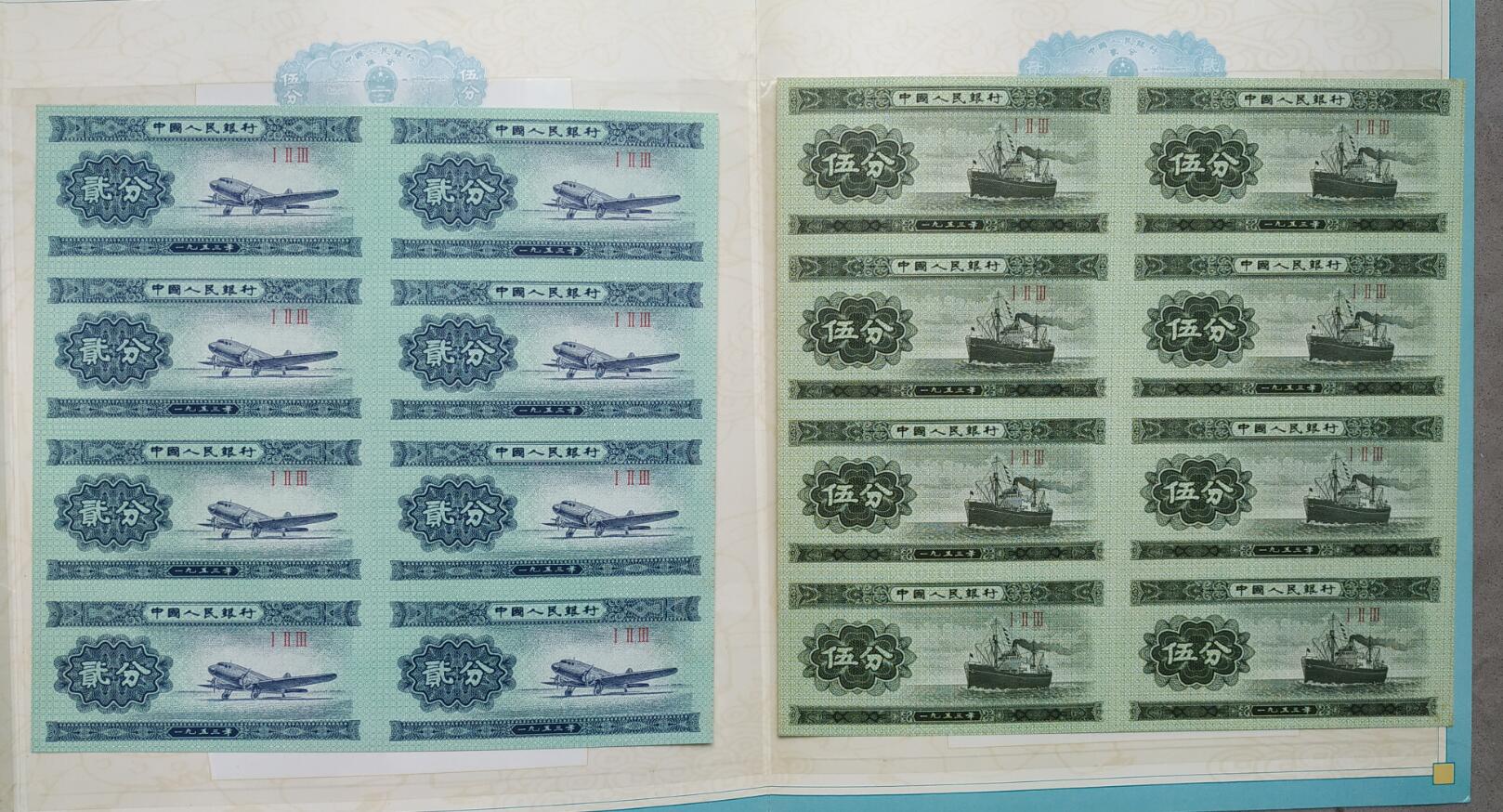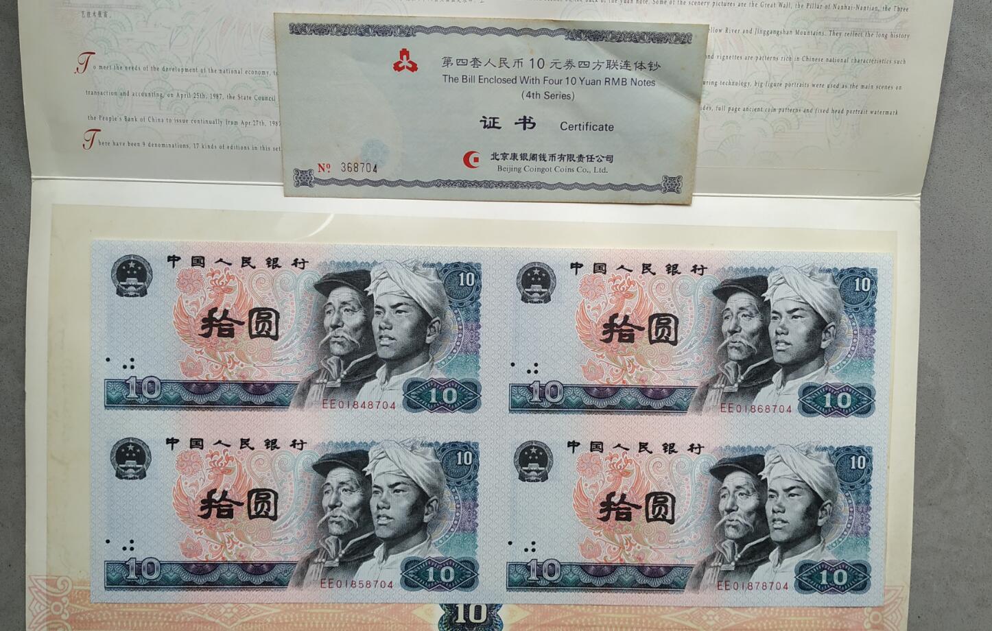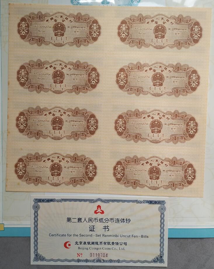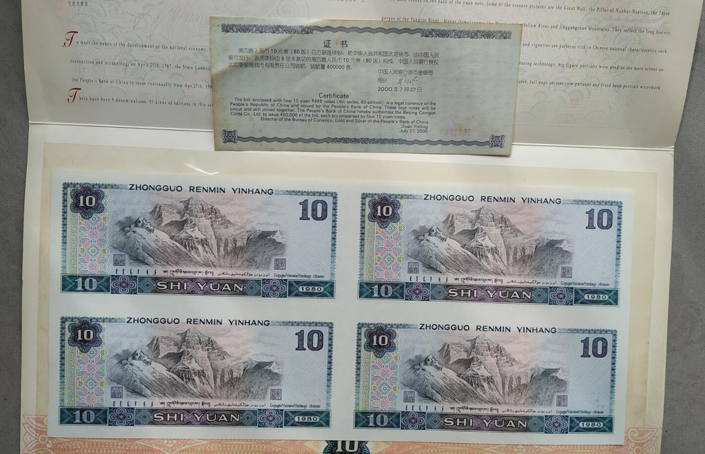 8010四连体,对号,证书有黄,钞干净。分币八连体单大册,边缘有黄。2套一共1520元