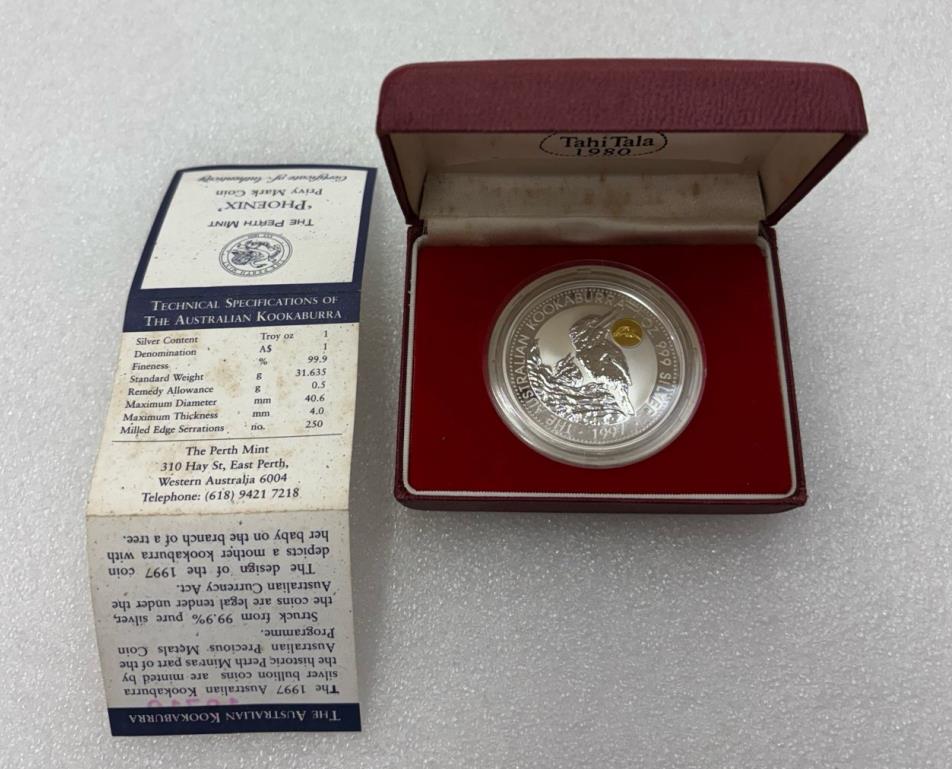 1997年是镶嵌金凤凰的,比较少见,1盎司纯银,带证书盒子