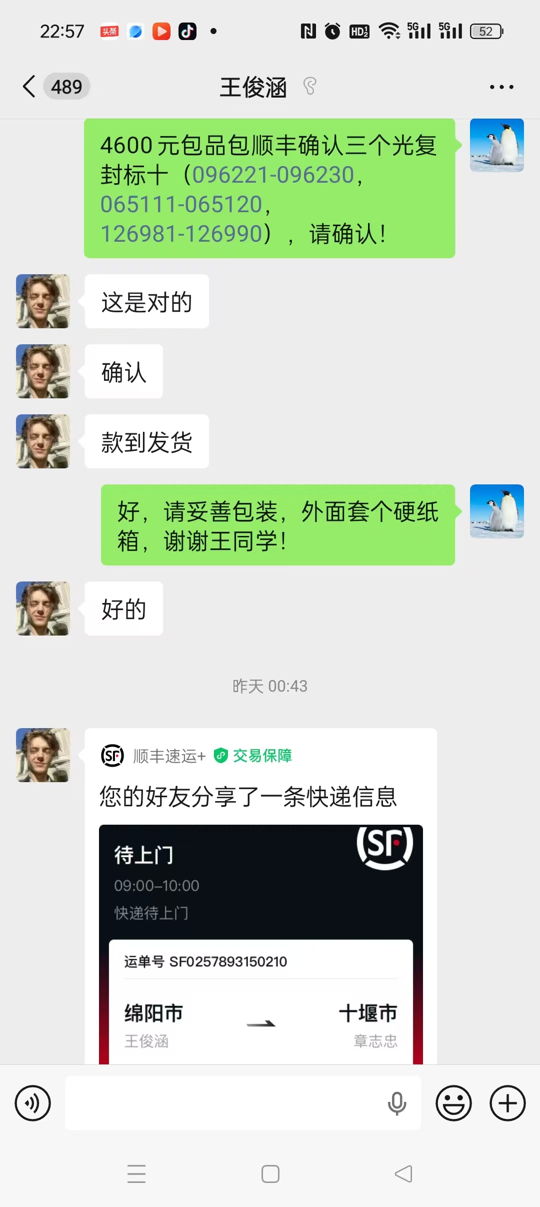 王俊涵确认时要求款到发货,但是当天晚上00:43分就下单顺丰,上午我没付款他就把货给我发出来了,其中缘由实属反常.