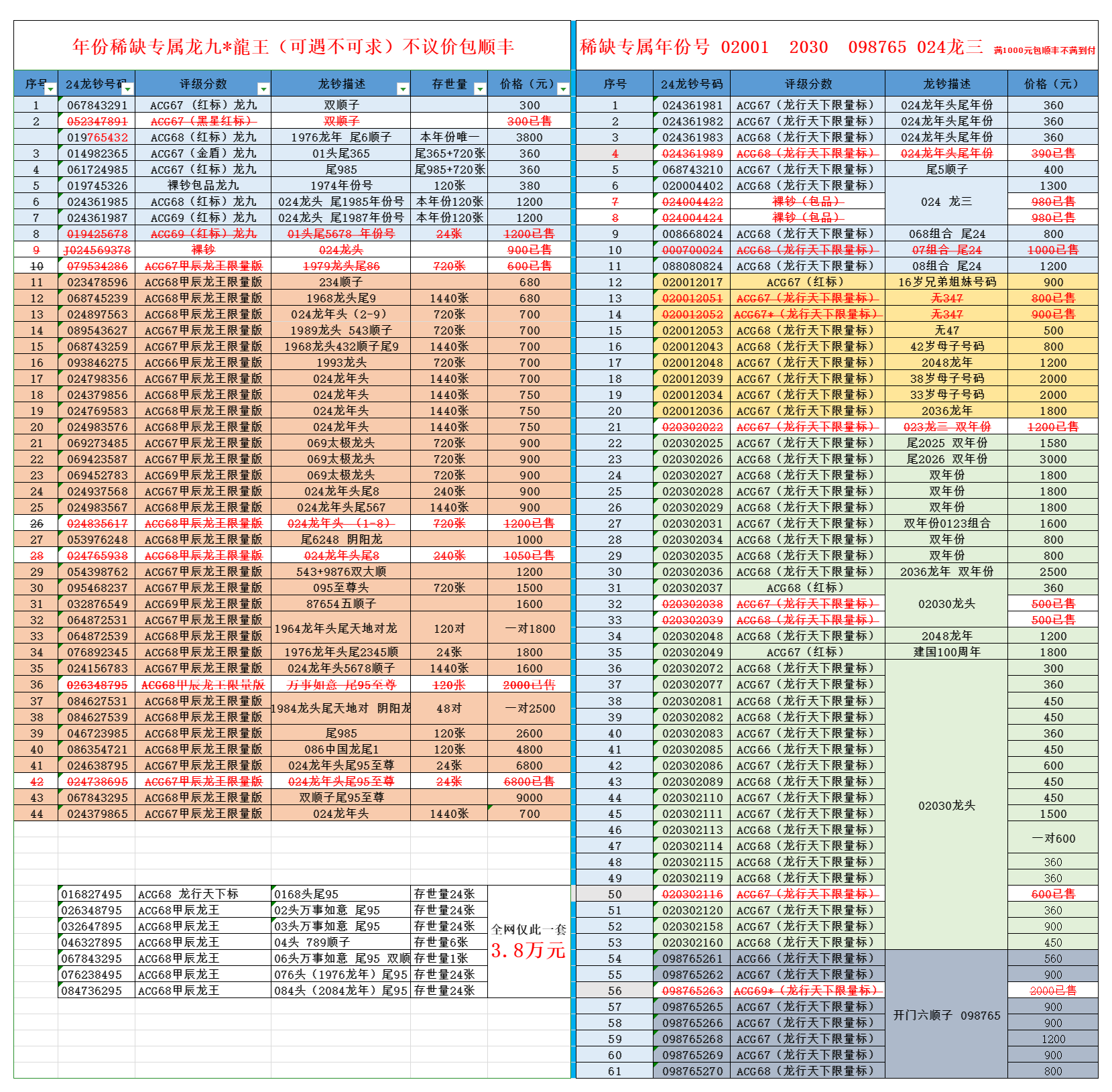 02001 02030 098765 六顺子 年份号 乱蛇 024 龙三 乱龙 龍王 乱蛇 尾95 至尊龙 价格如图