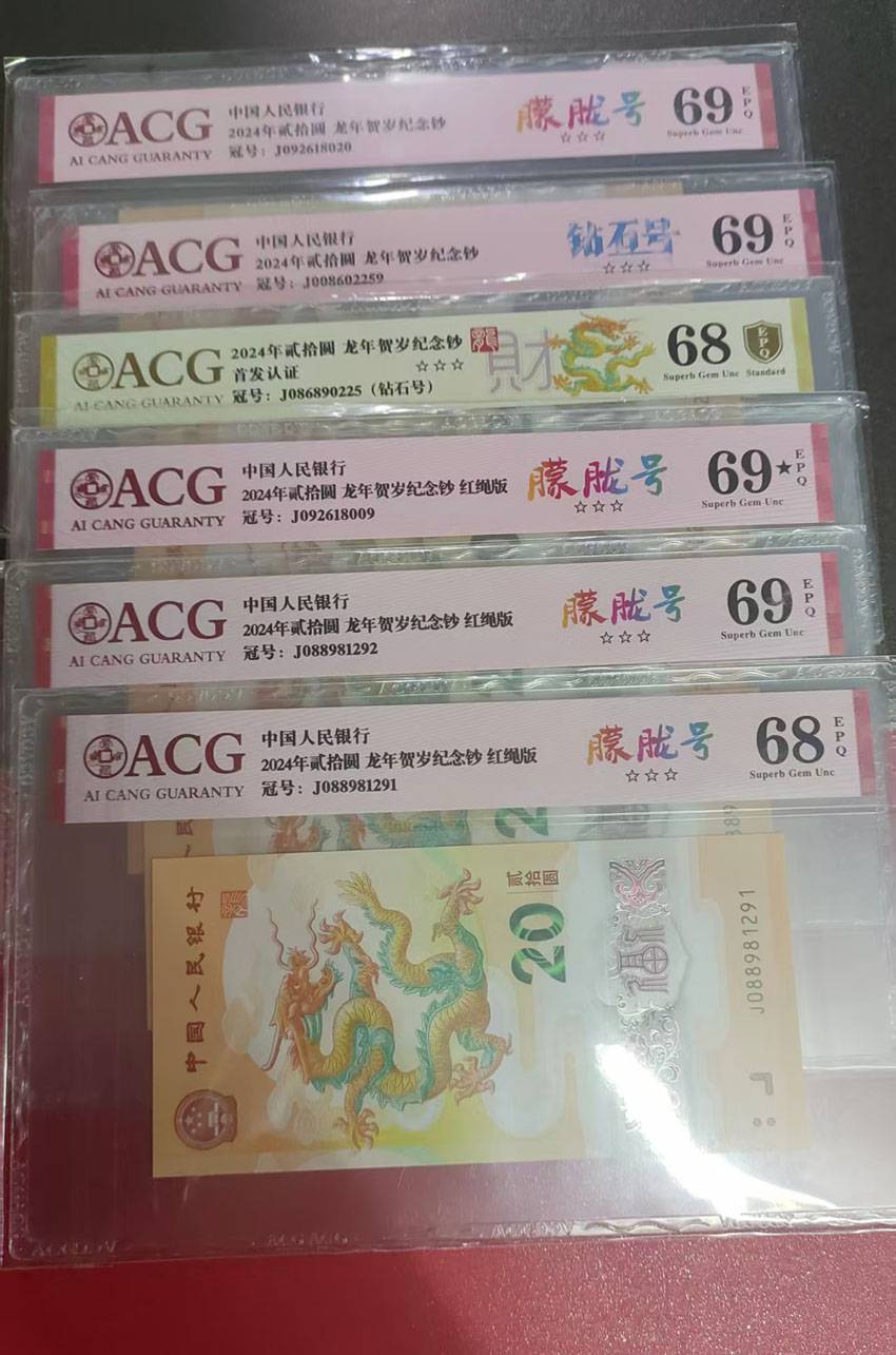 龙钞朦胧号如意号几张,爱藏评68分和69分,如图所示一共7张,通走620一张,不单卖。