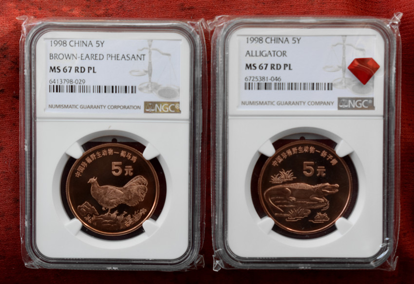 NGC 精制珍稀野生动物 裼马鸡 杨子鳄 金斑蝶 华南虎(NGC MS67PL)盒子完好无裂
