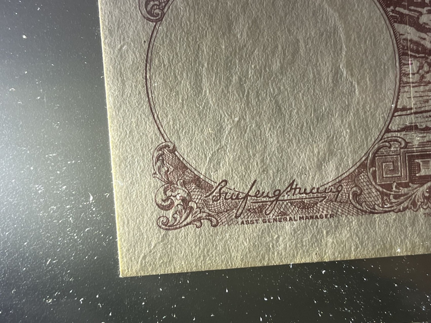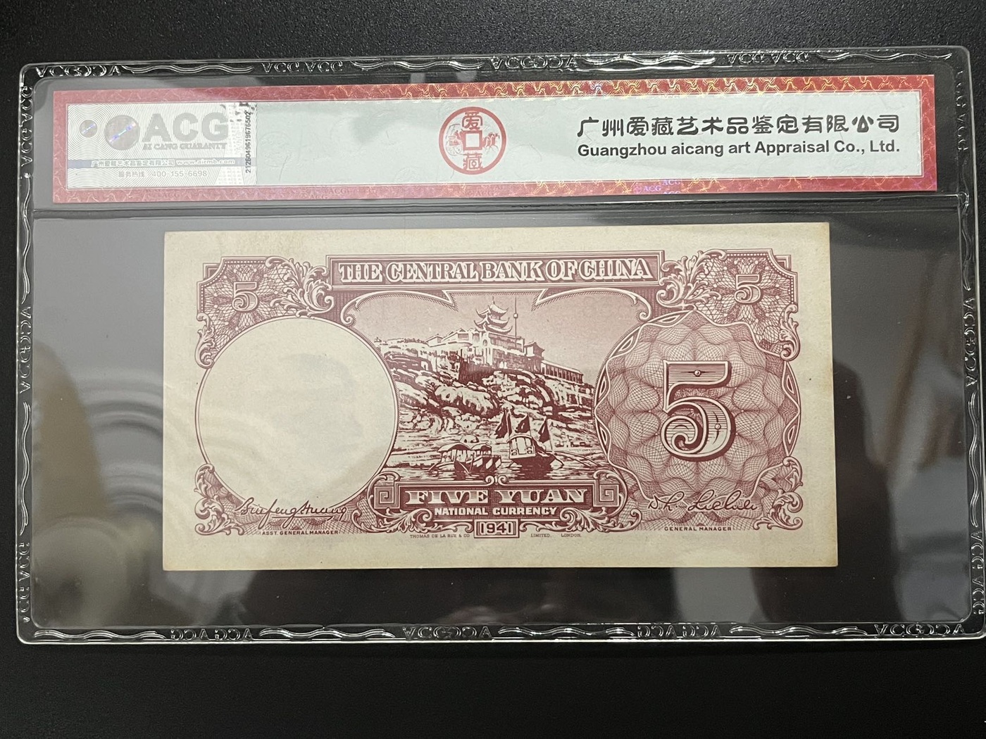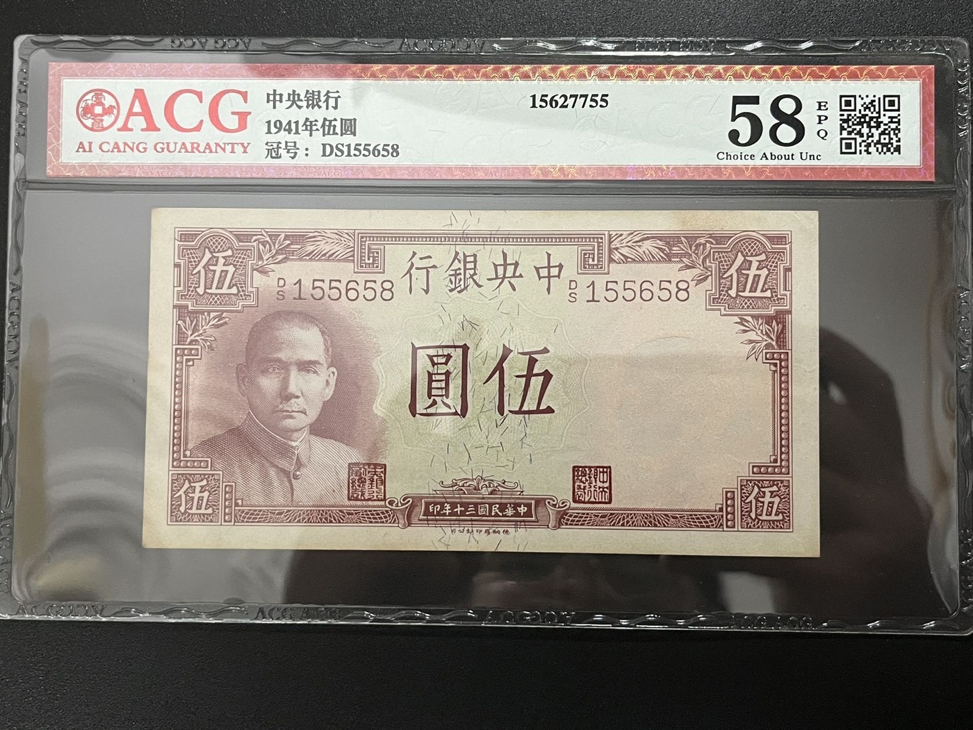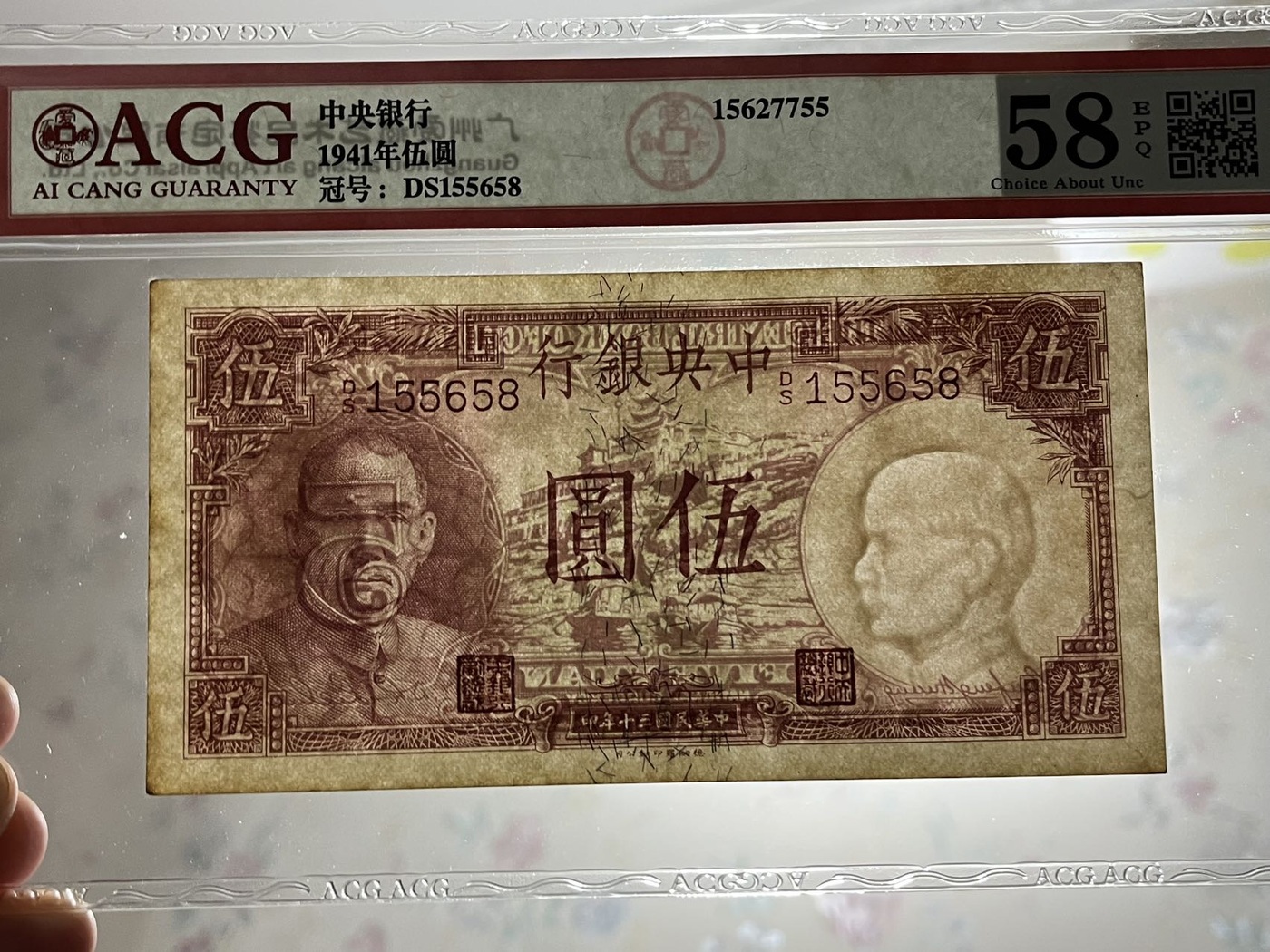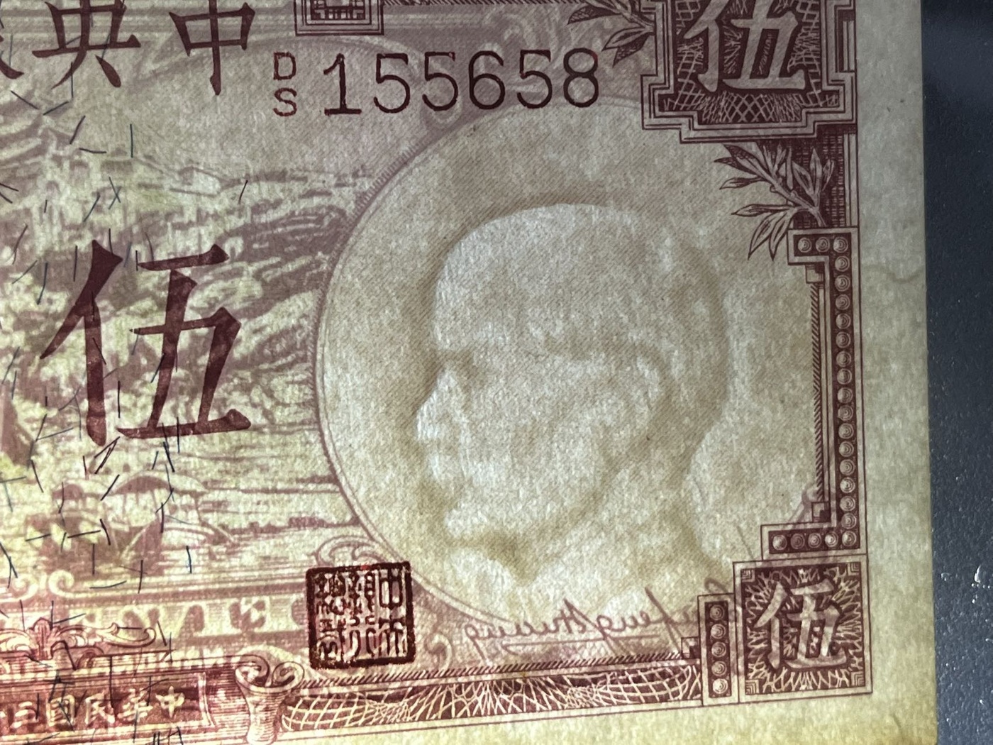 中央银行五元,民国三十年,德纳罗版,稀少金马号尾8,早期老评,自带原始褶皱,头像水印,惠售118元包邮,联系确认