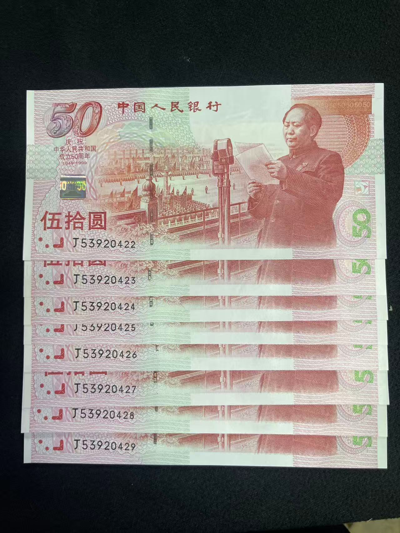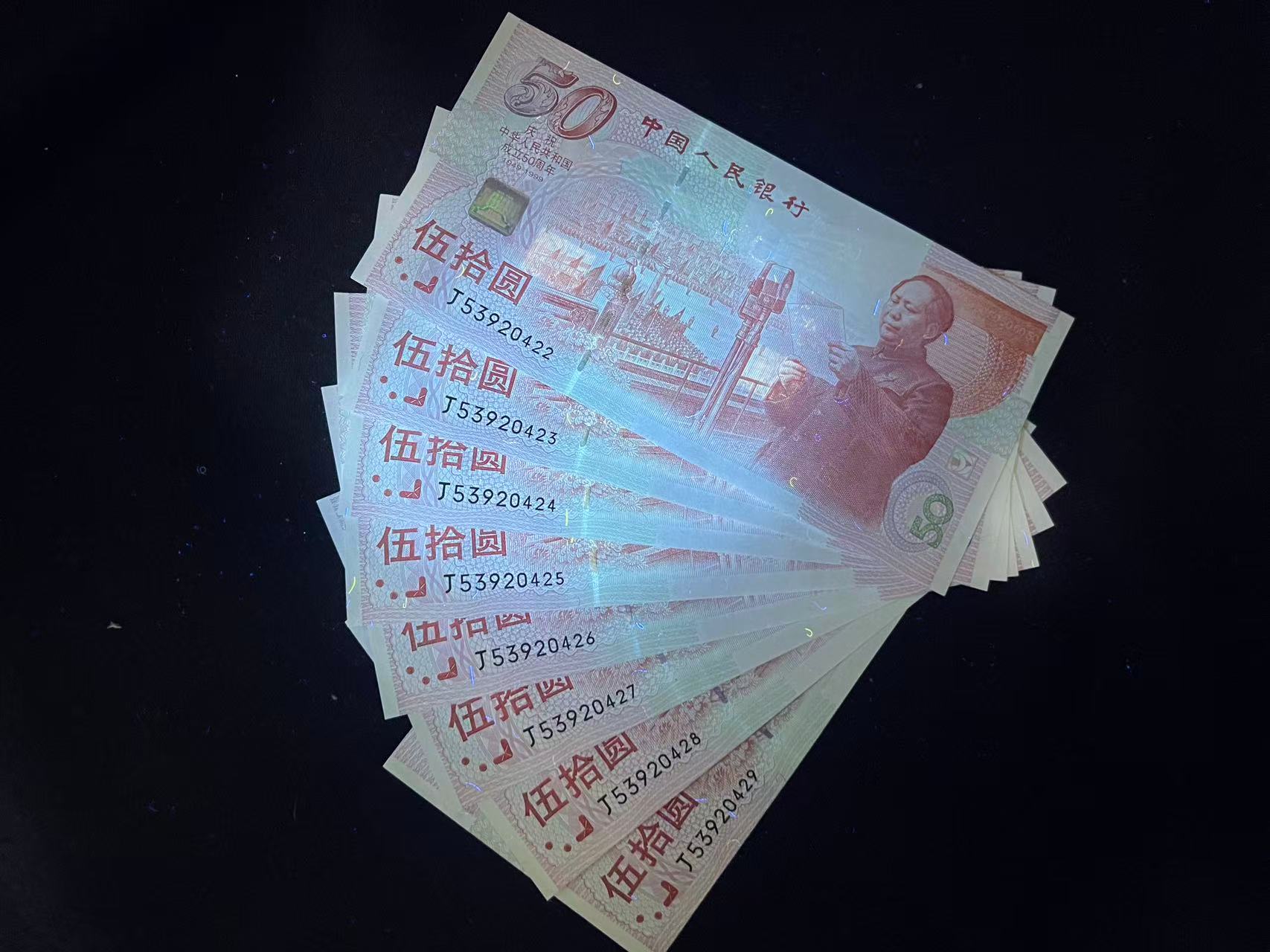 建国钞纪念钞50元,全新绝.品,灯下无斑。8张连号通走