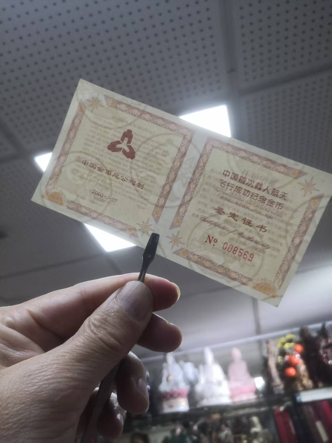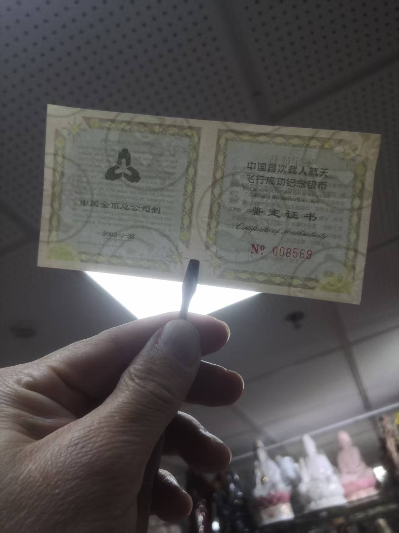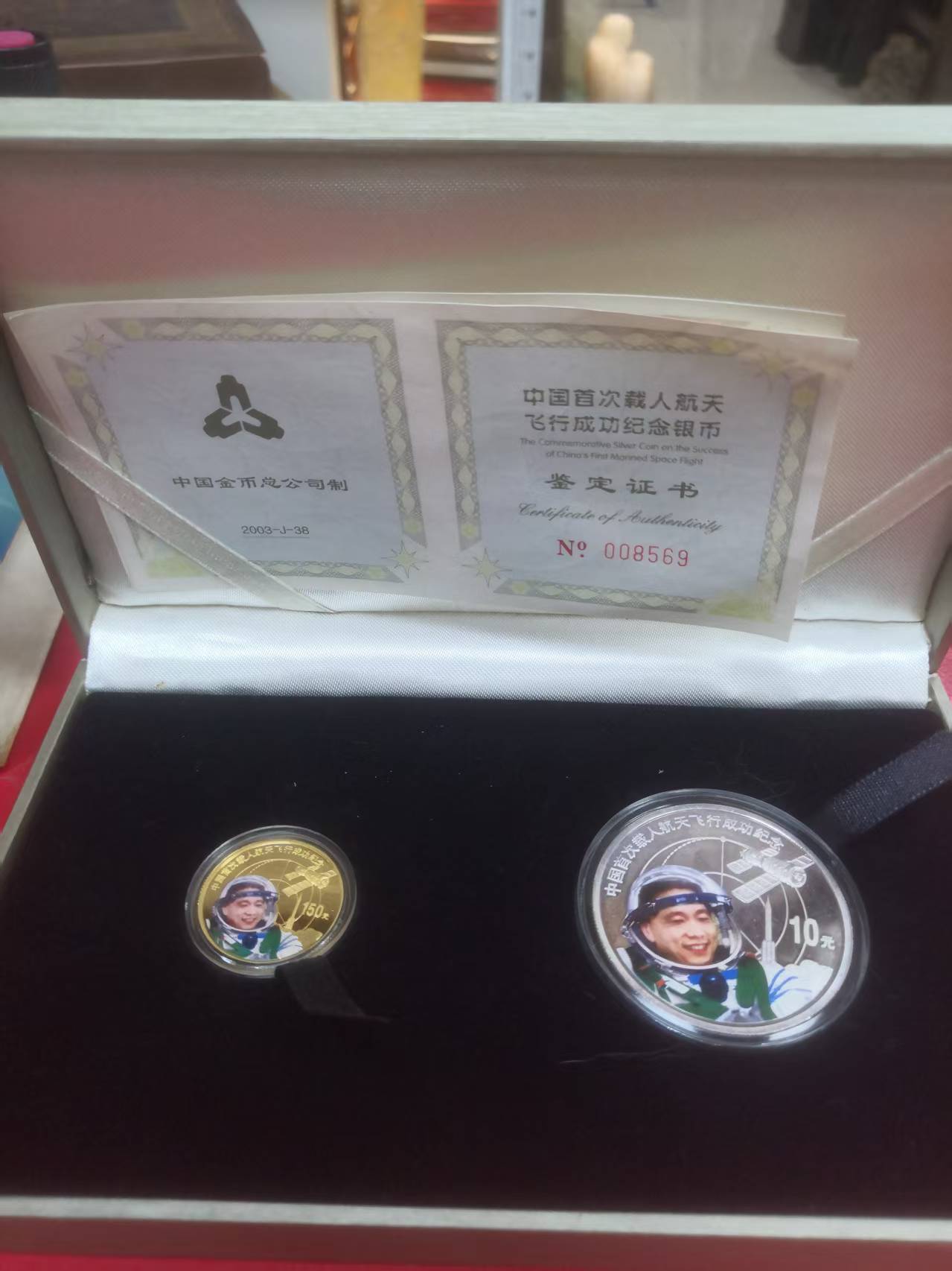 03年航天杨利伟金银币1/3盎司金,1盎司银,证书同号:008569,价10500元三包