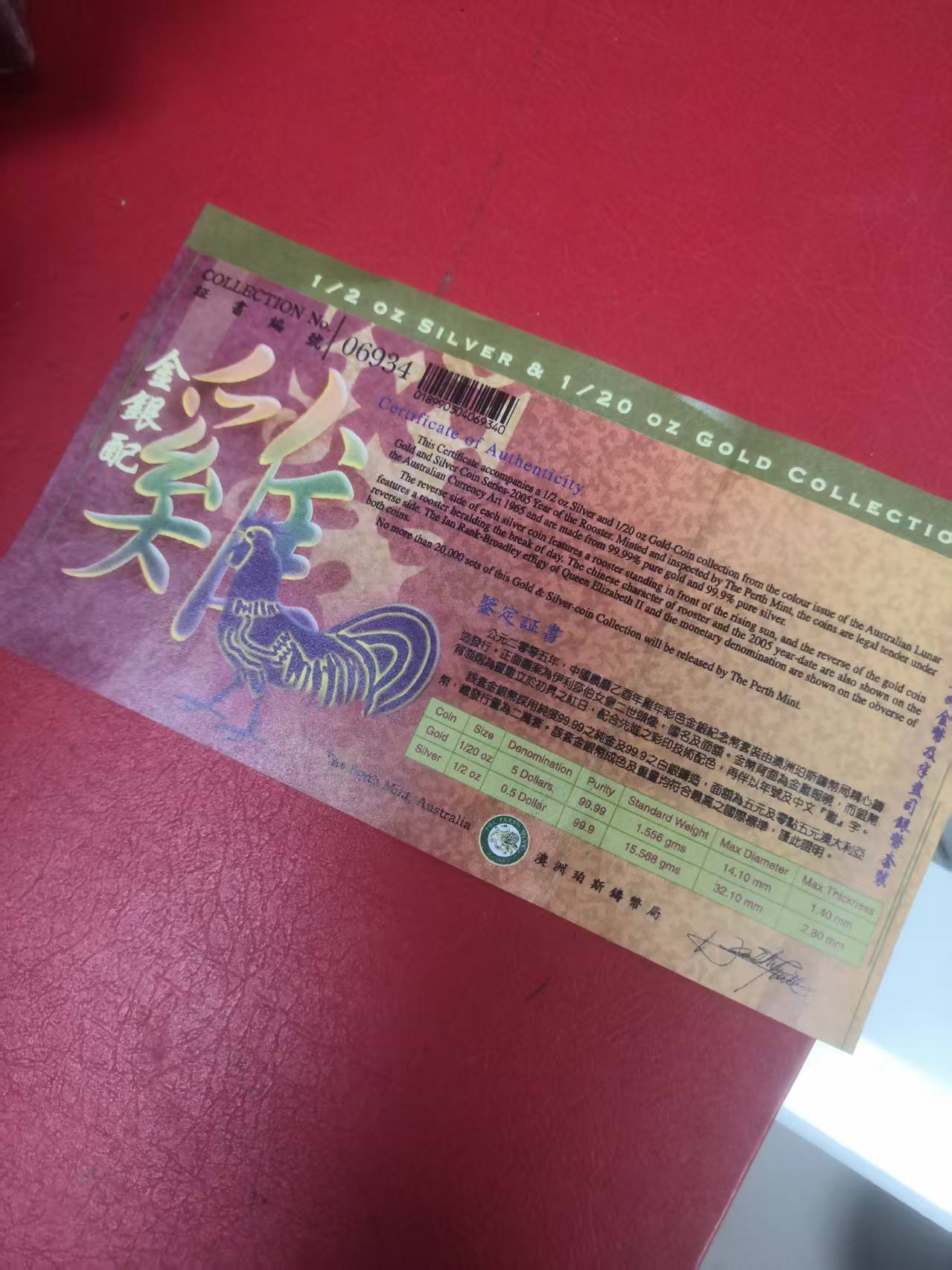 05澳大利亚鸡年金银币1/20盎司金,1/2盎司银,1650元